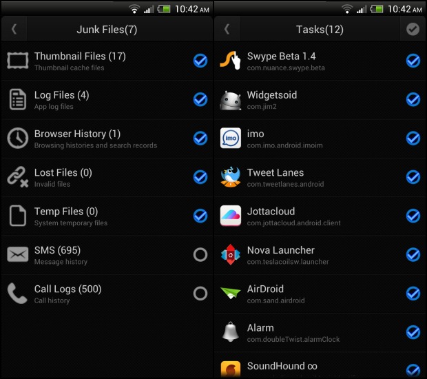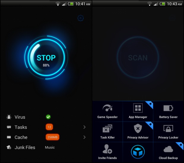 همونطور که گفتم کار با این اپ به مهارت خاصی نیاز نداره. برای پاکسازی سیستم از وجود فایلها مخرب، ویروسها، فایلهای کش و ... تنها با فشردن دکمه Scan که وسط اپ قرار گرفته، میشه تمام گوشی رو یبار بطور کامل اسکن کرد (بدون اعمال کوچکترین تنظیمات دستی).