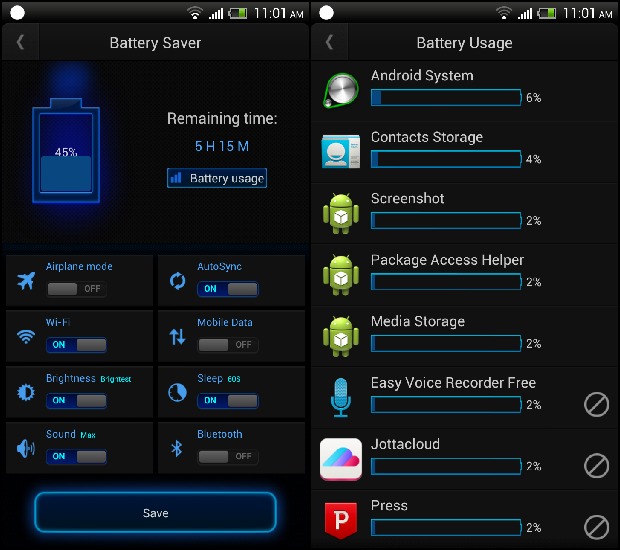 AMC Battery Saver به شما این امکان رو میده تا اون سرویس ها و اپ هایی که لازم ندارین رو بصورت موقت و فعلی متوقف یا ببندین و جلوی استفاده بی رویه باتری رو بگیرین. همچنین پیشنمایشی از اپ ها و سرویس هایی که باعث خالی شدن باتری میشه رو یتون نشون میده + مدت زمانی که می تونین با این میزان شارژ باقیمانده از دستگاهتون استفاده کنین.